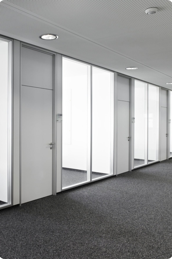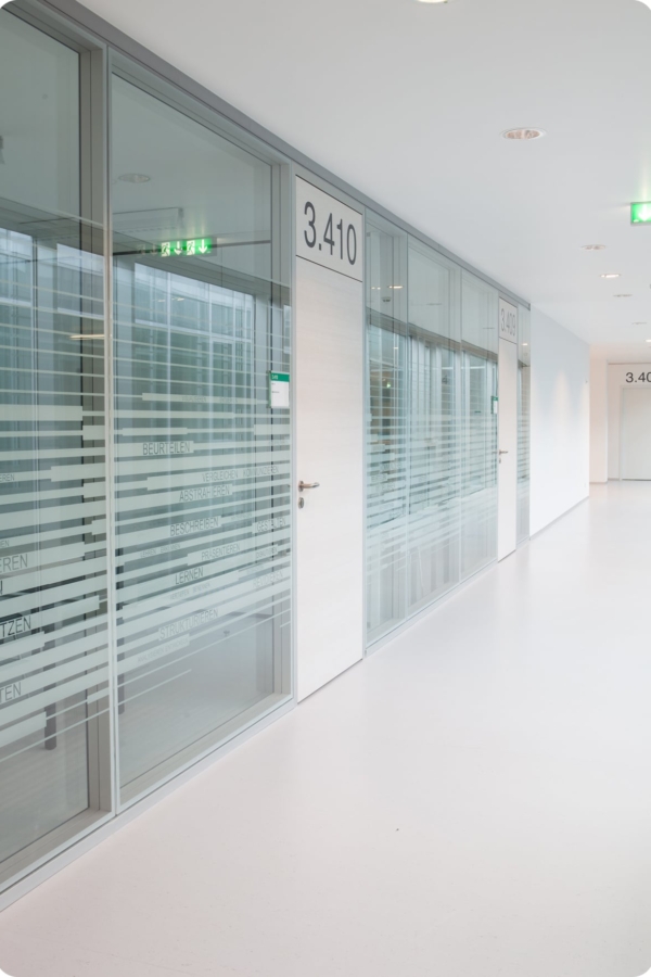 Glaswände in Ständerbauweise vereinen eine moderne, lichtdurchflutete Optik mit einer stabilen Tragstruktur. Sie eignen sich ideal als flexible Trennwandsysteme für verschiedene Innenräume. Durch eine Kombination aus schlanken Profilen und großen Glasflächen bieten sie eine elegante, offene Raumgestaltung.