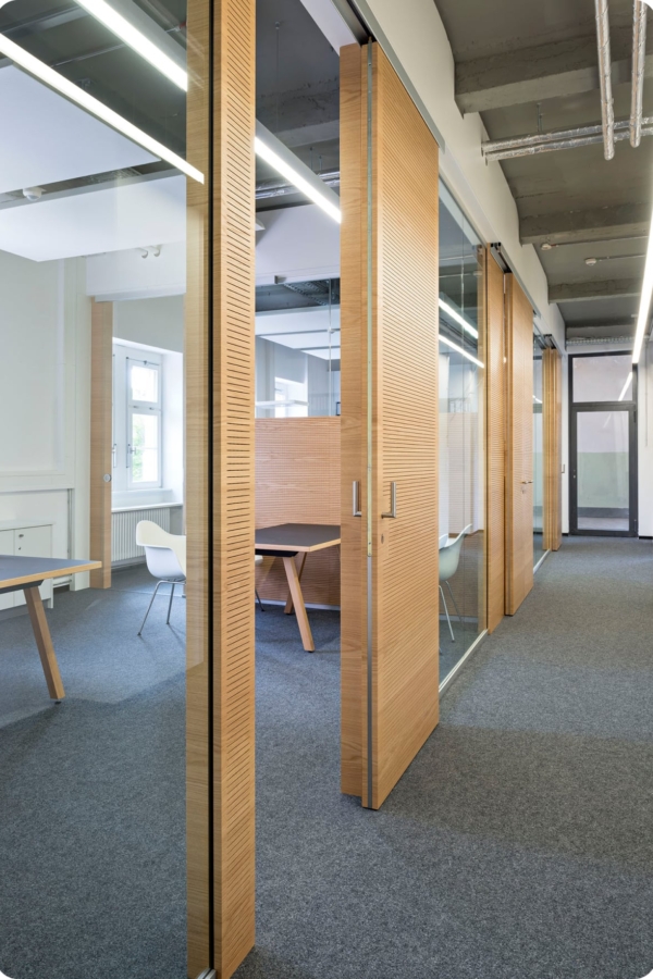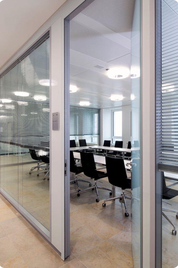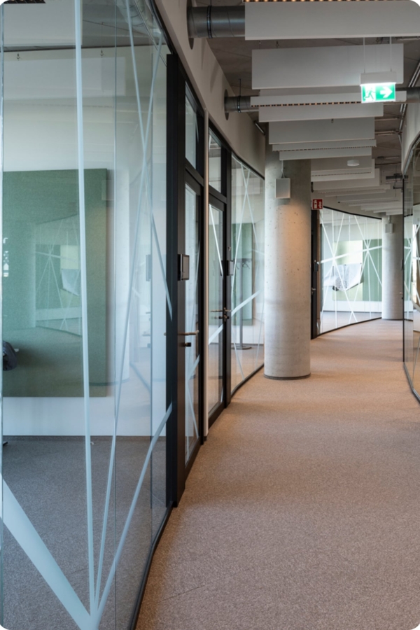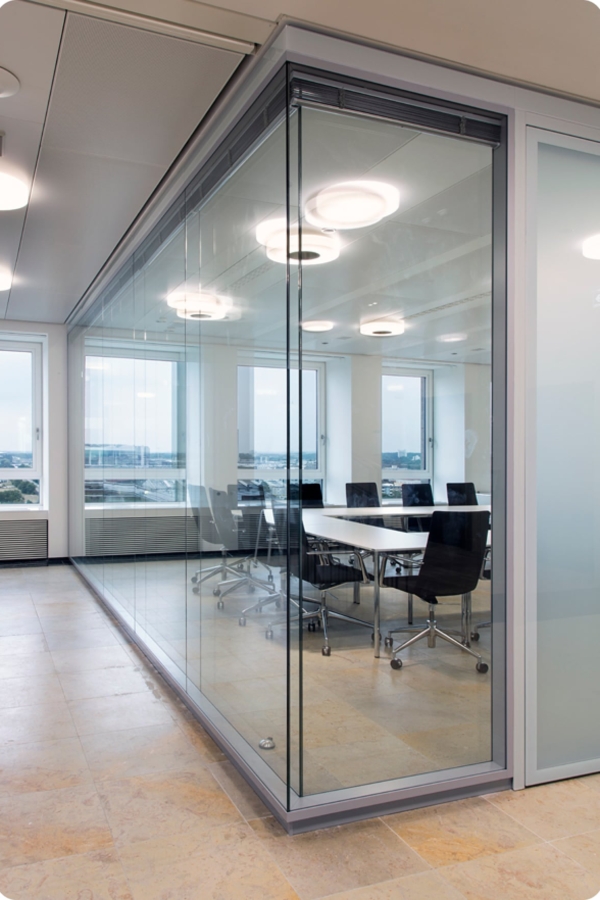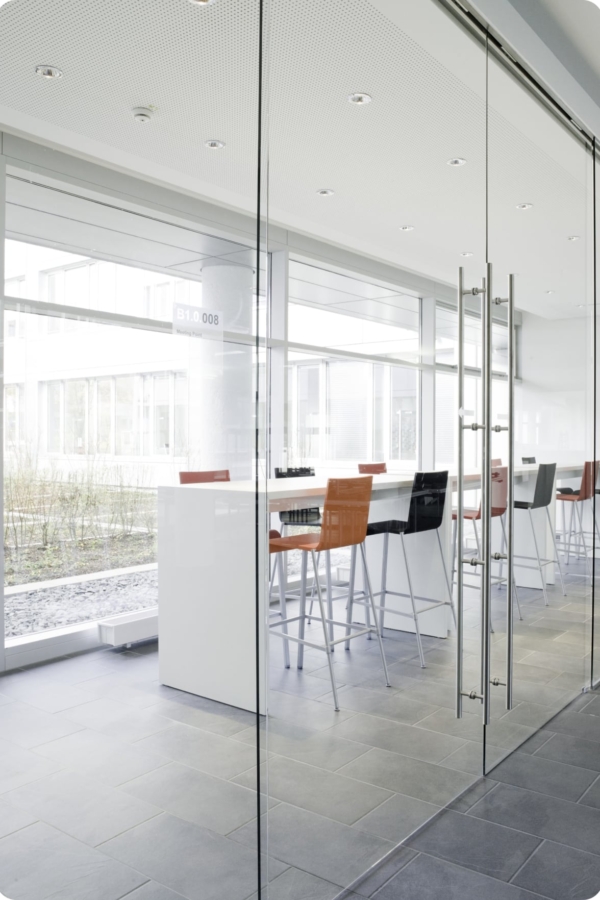 Rahmenlose Glaswände schaffen eine moderne, transparente Optik ohne sichtbare Unterbrechungen und dienen als flexible Trennwandsysteme. Sie sind raumhoch und fügen sich nahtlos in unterschiedliche Umgebungen ein, etwa in öffentliche Gebäude oder Praxen.